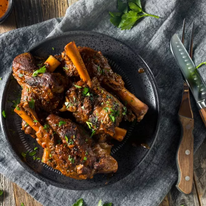 Souris d’agneau confite au miel, à l’ail et au romarin