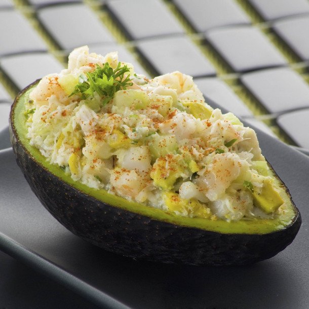 - Garnissez les demi-avocats évidés avec cette préparation. Décorez avec les crevettes.