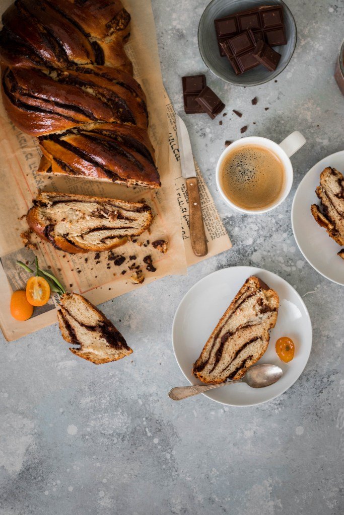 7. Etalez la garniture sur la pâte. Roulez-la sur elle-même comme pour une bûche puis coupez-la en deux sur la longueur. Formez une tresse avec les deux morceaux en laissant apparaître la partie chocolatée sur le dessus.