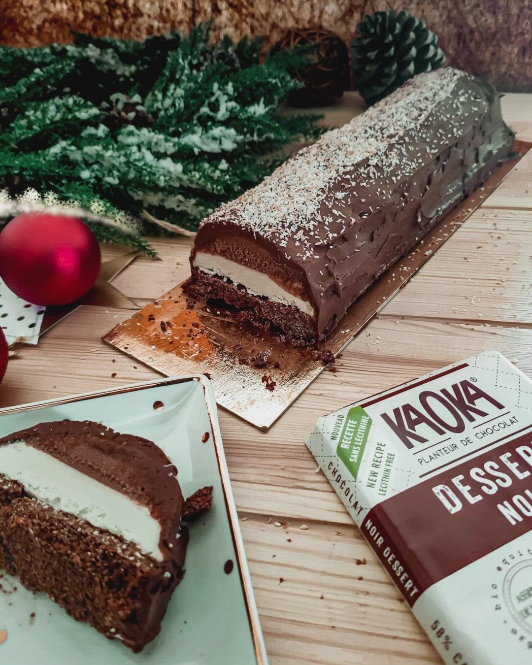 - Glaçage : Dans un bol faites fondre 100g de chocolat avec le lait de coco (la partie liquide de la boîte). Étalez le mélange sur la bûche. Lissez à la spatule et saupoudrez de noix de coco râpée et toastée.