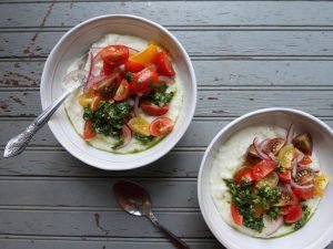 Une version rapide et estivale d’un plat d’hiver! Alors que la polenta est riche et crémeuse, la salade de chimichurri et de tomates-oignons compense cette richesse.