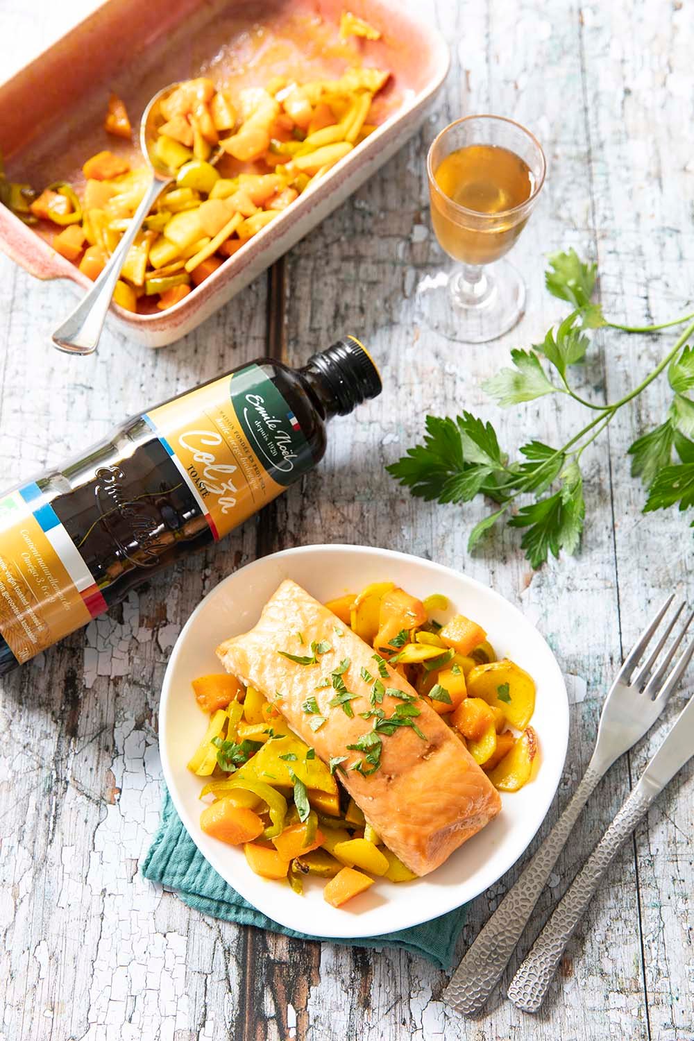 - Servez les légumes rôtis dans une assiette. Déposez un filet de saumon et nappez le tout d’un filet d’huile de colza toasté. Saupoudrez de persil haché et régalez-vous !